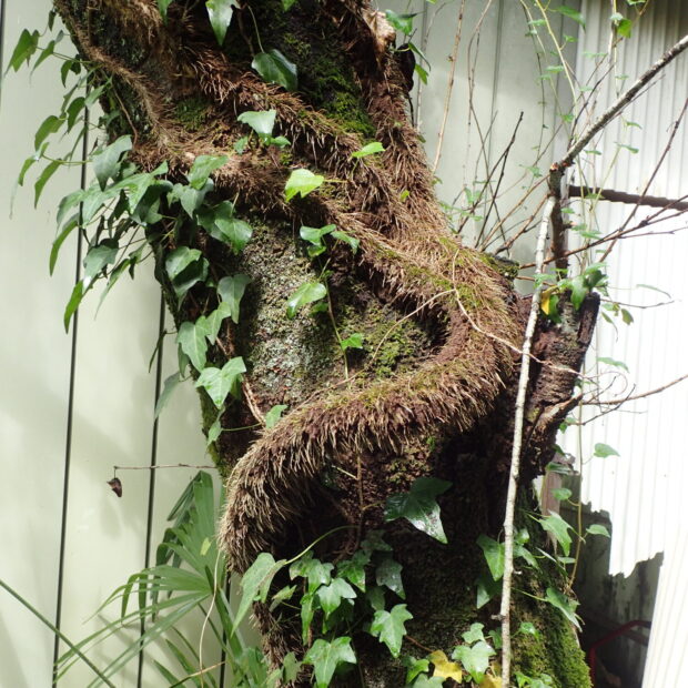 幹や枝の途中から根(=気根・きこん)を出します。 この気根で他の木や壁にとりつき、 はい上がっていきます。