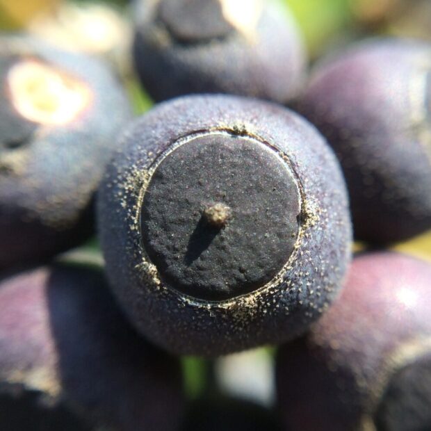 丸くて黒っぽい実が初夏に熟します。 実のてっぺんには雌しべがピョンと残ります。