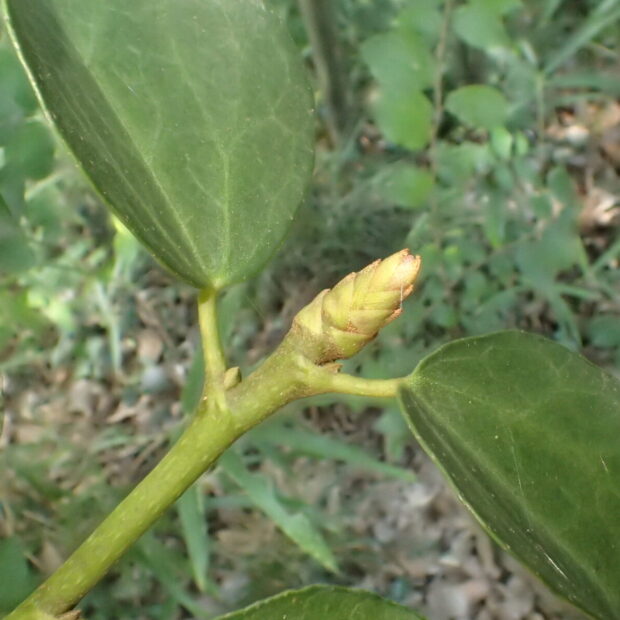 先のとがった卵型で、 縁にギザギザはなく、 毛もなくてつるつるすべすべの葉です。 若い葉では、 ゆるいトンガリが3つあったり5つあったりするものがあります。 大小も様々です。