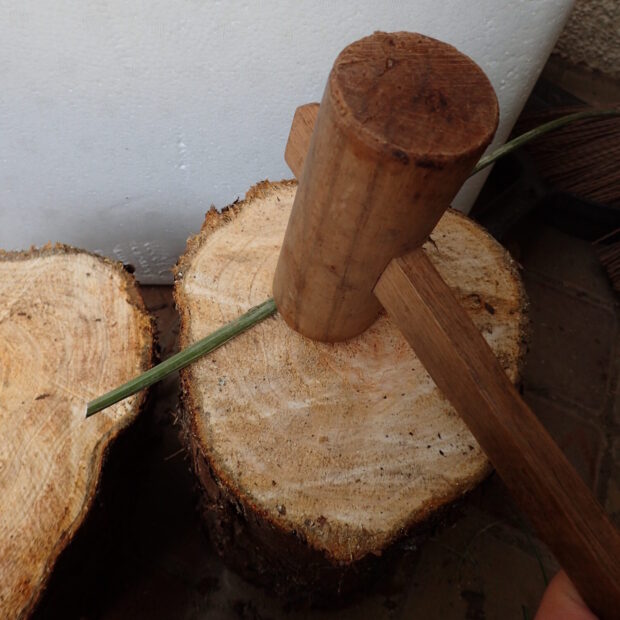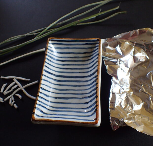 • 取り出した髄と陶器の器とアルミホイルと油を準備