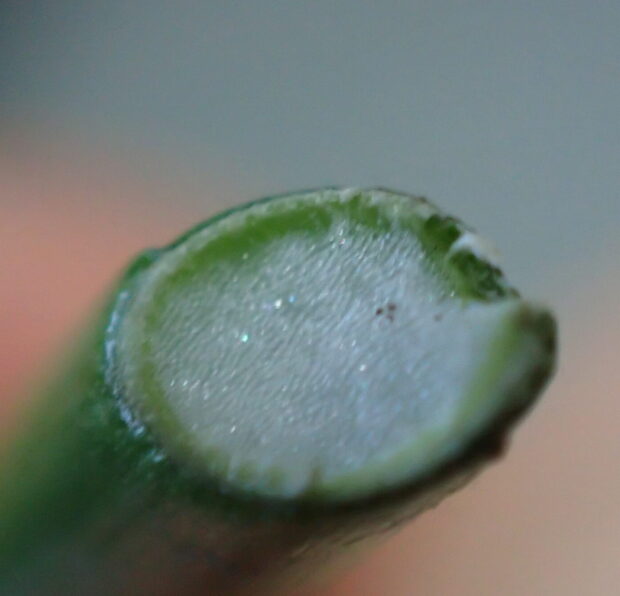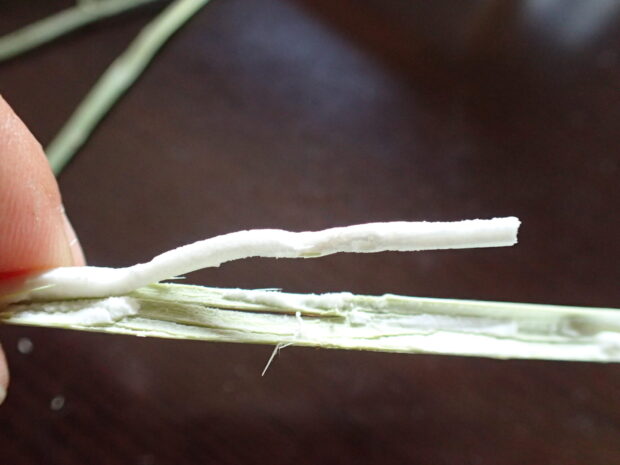 昔は電灯がないので、 油に芯をひたして火を灯していました。 その芯はイグサが主に使われていたようですが、 ヤマブキやアジサイも利用されていたようです。 そこで茎の中の白い髄を取り出して油にひたして火を灯してみましたが、 すぐに消え、 長くはもちません。 火をつけなくても髄を取り出すだけでも面白いですよ。