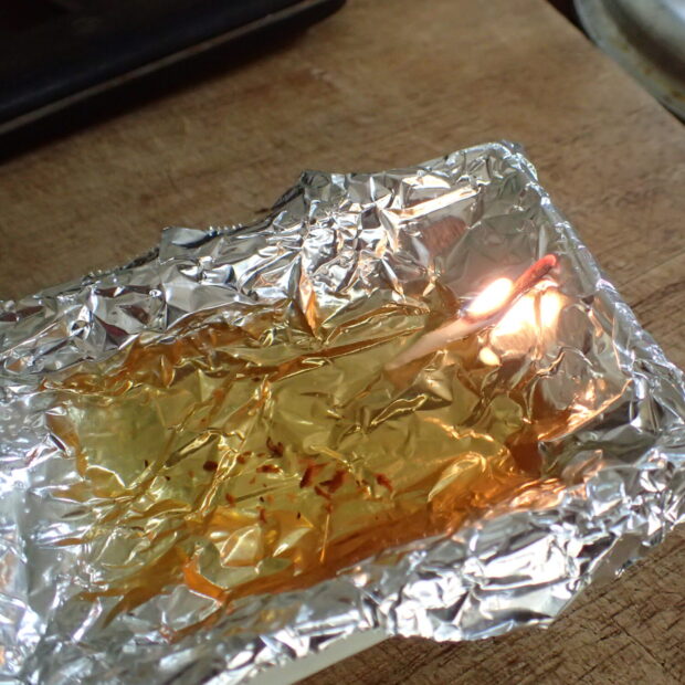 • 器にアルミホイルをかぶせ、 油を入れ、 髄をひたして火をつける