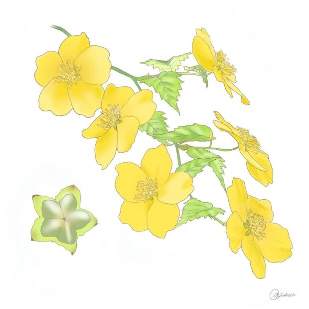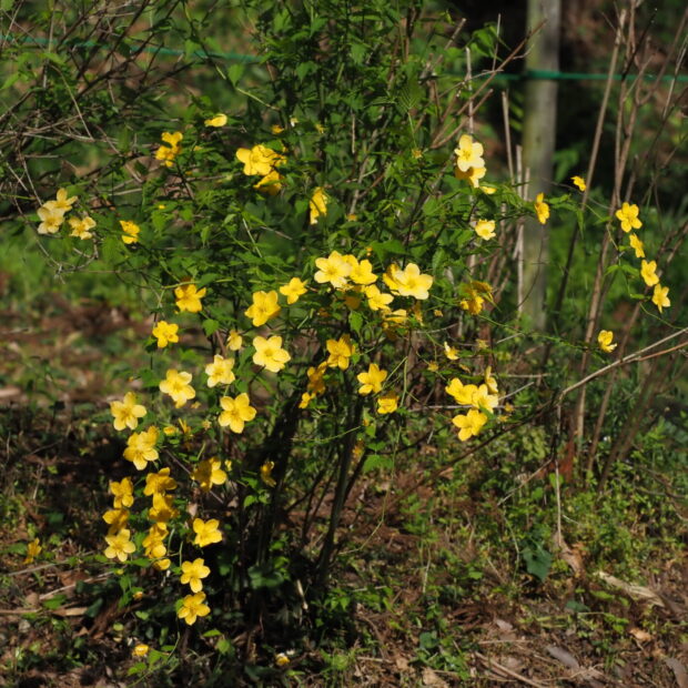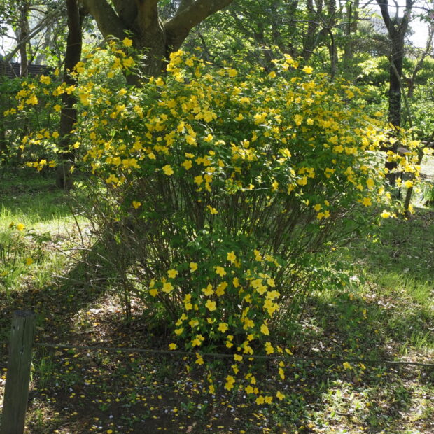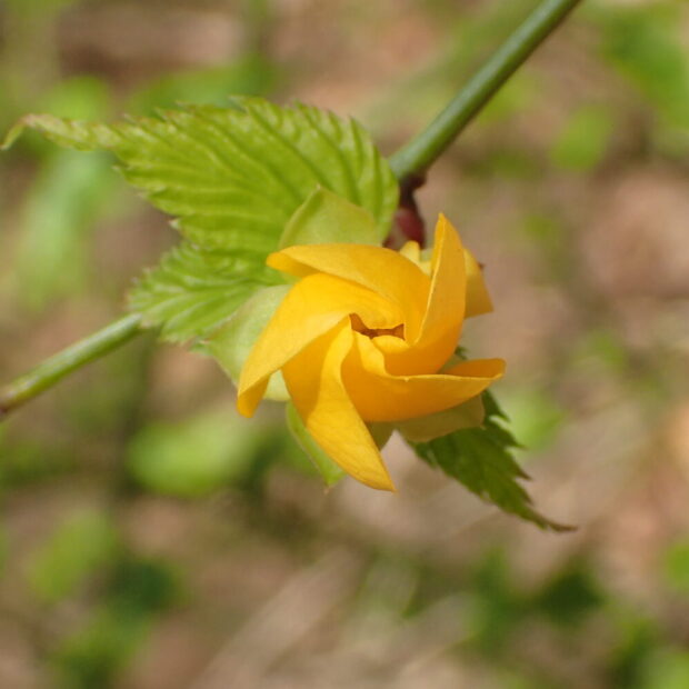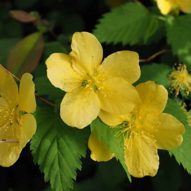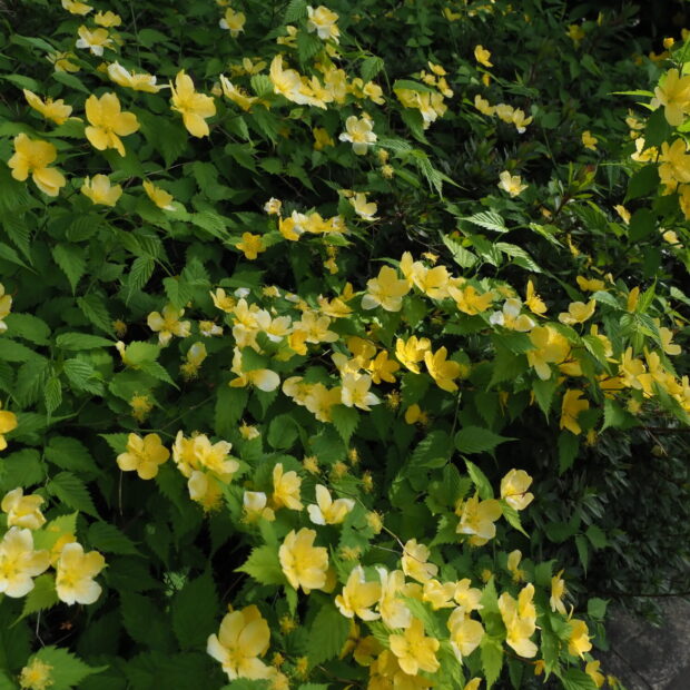晩春、 弓なりに垂れ下がる枝に黄色い花をたくさん咲かせます。 花びらが5枚の一重咲きが一般的ですが、 雄しべが花びらに変化した八重咲きのヤエヤマブキという園芸品種もあります。