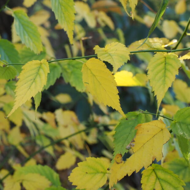 葉先がヒューッと長く伸びています。 細かいギザギザのある縁が、 さらに大きなギザギザを形作っている「重鋸歯」という特徴があります。