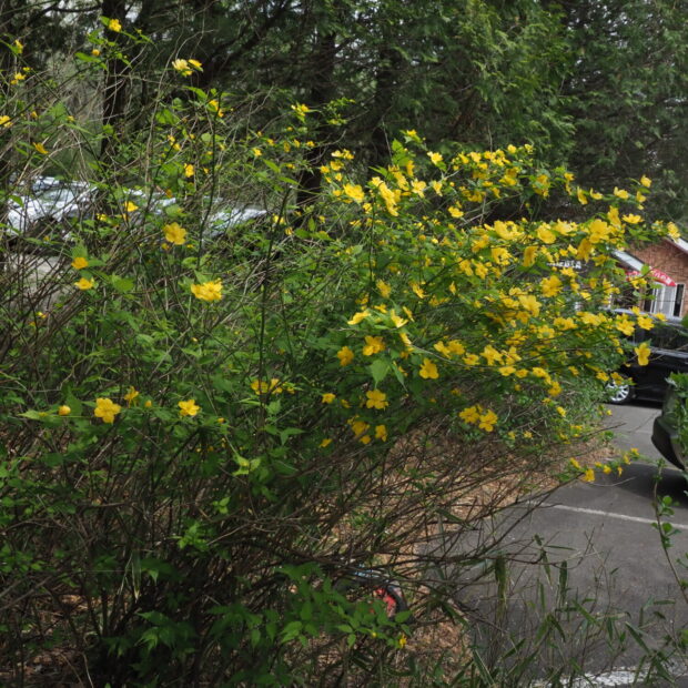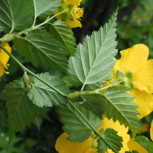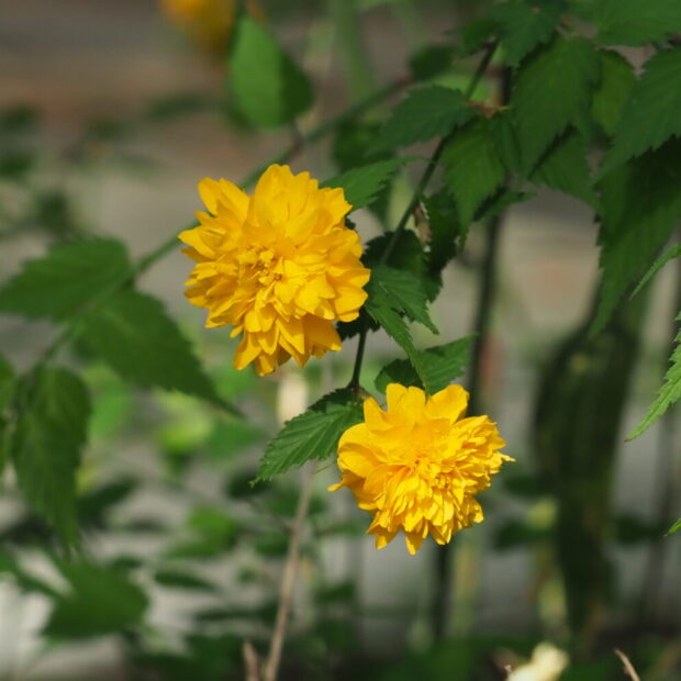公園や庭には八重咲きのヤエヤマブキがよく植えられています。