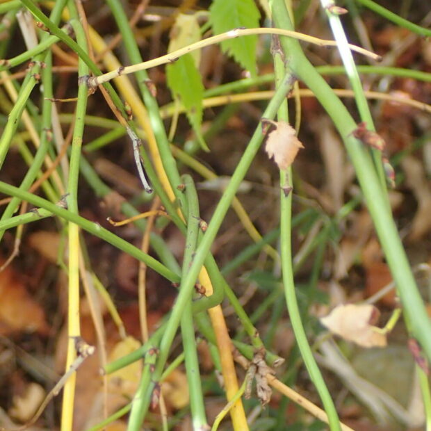 木々の下で、 低い木としてどんどん横へ広がります。 太く高くなる大木とは違い、 下から伸ばしては枯らし、 また伸ばすという生活します。 緑の茎の中にはスポンジのような髄が入っていて、 早い、 安い、 丈夫の三拍子がそろっています。 5年ぐらいしたら、 枯らしてまた新しく作るので枯枝がたまっています。