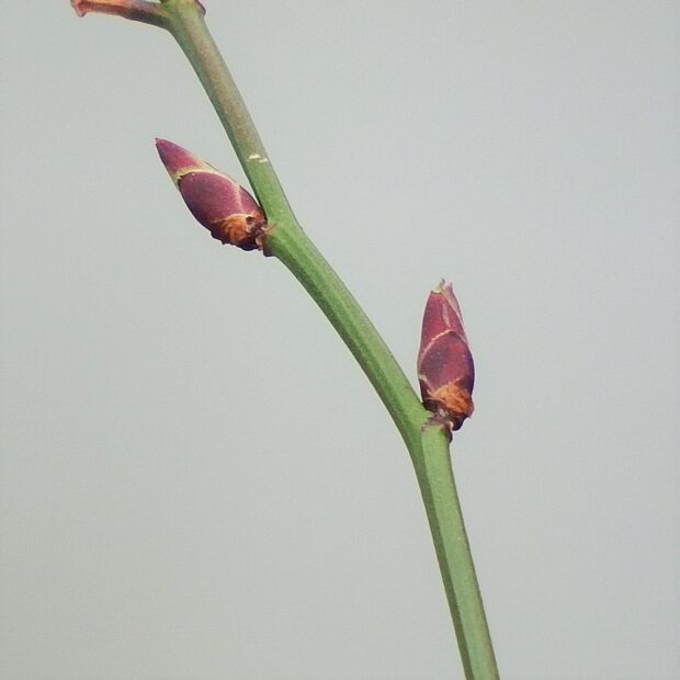 新しい枝は明るい黄緑色で稜とよばれる縦の筋があります。 枝はやがて黄色〜褐色になり、 3〜5年で枯れます。