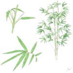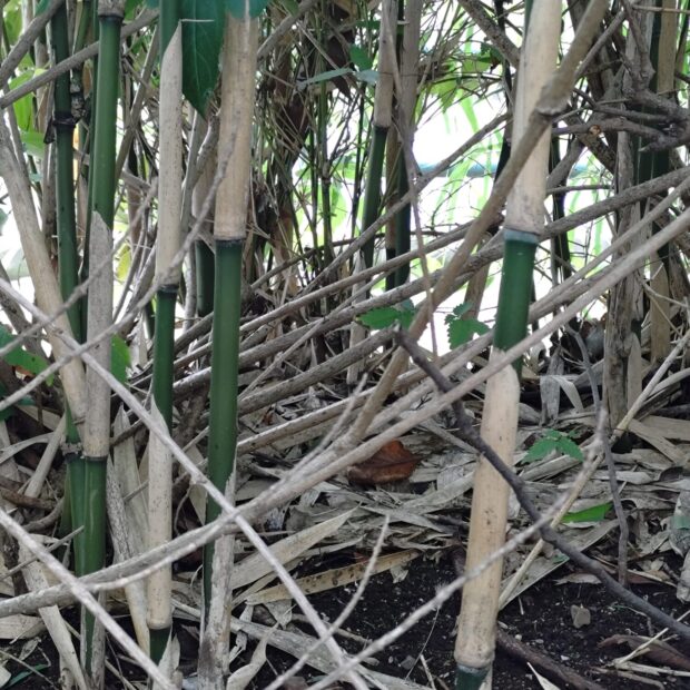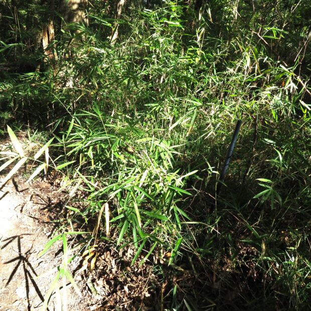 稈鞘(元々は筍を包んでいた皮)は剥がれずに鞘の節間の約2分の1~3分の1を覆います。 節はやや膨らみ、 一つの節から3本以上の枝が出ます。 稈の太さは直径2㎝程度になります。