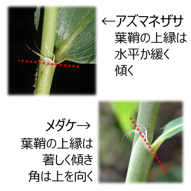・アズマネザサとメダケは関東地方南部の人里で混在してよく見かけます。 中間的なものもあり識別が難しい場合もありますが、 ポイントは葉の下垂具合、 先端のとがり方、 葉鞘の上縁の傾斜の度合いの3つです。