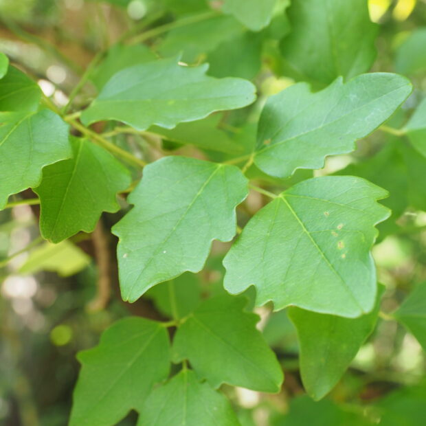 周りにゆるいギザギザがある小さな葉が3枚1組で、 1枚の葉っぱです。 普通は冬に落葉しますが、 落葉しないこともあります。