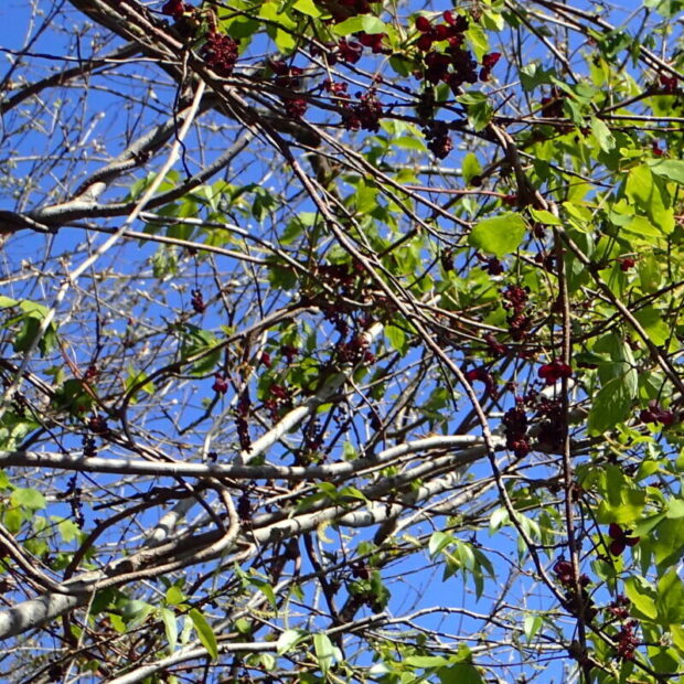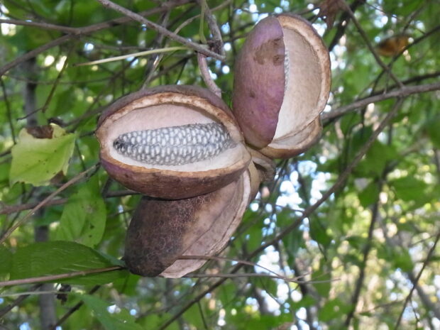 熟すと、 きれいにパカッと割れます。 白い果肉と黒い種が見えます。 これを見るとやはり食べたくなりますね。 これまた鳥も同じ気持ちになるのかも。