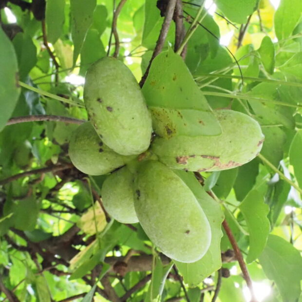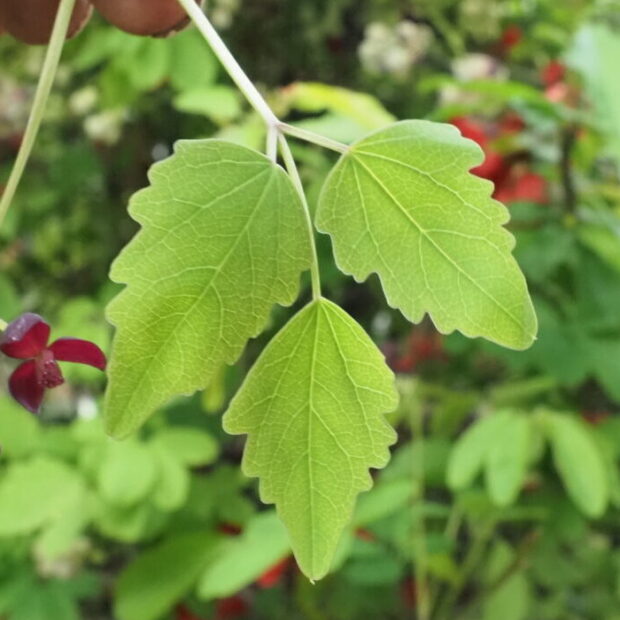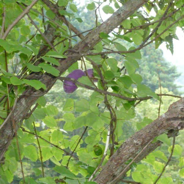山野に生えるつる植物で、 周囲が波打つようになった3枚で1組の葉っぱが目印です。 冬に落葉するとアケビと見分けるのは難しいです。