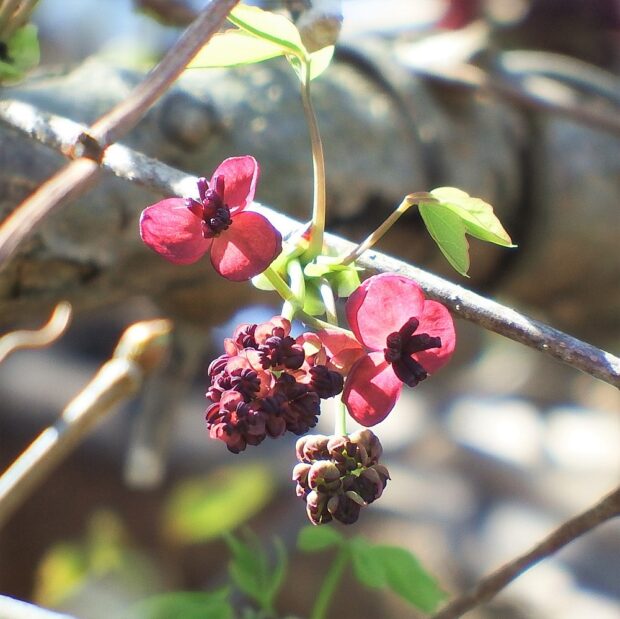大きな雌花が数個、 その先に小さな雄花が多数出てきて垂れ下がって咲きます。 アケビと花の色が少し違い、 雌花も雄花も濃い紅色です。 (雄花については花色が薄い場合もある)