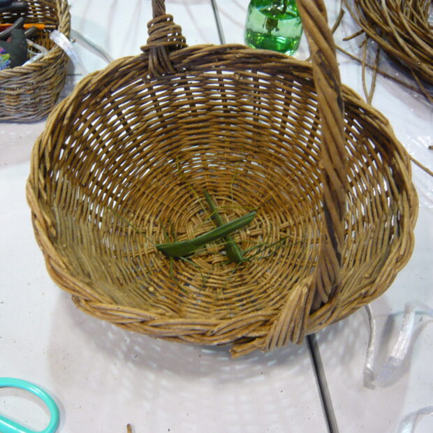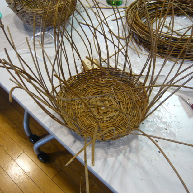 かご作りに使うつるは、 夏の終わりから秋にかけて山で採取します。 他の木に巻き付いてクルクルしたつるもよいですが、 地面をまっすぐに伸びるつるが使いやすいです。 よく乾燥させて保管し、 かごを編む前に水につけてやわらかくして使います。