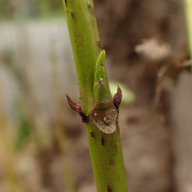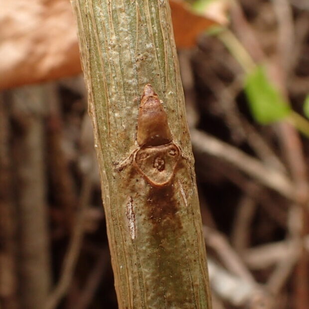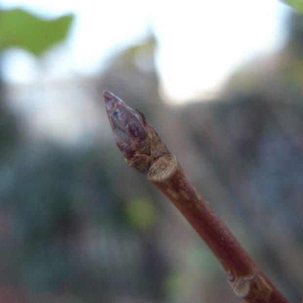 先がとがり、 つやのある赤茶色の芽です。 芽鱗は6〜8枚あります。 葉痕は半円形。 維管束痕は3つあるので、 とんがり帽子をかぶった人のお顔に見えます。