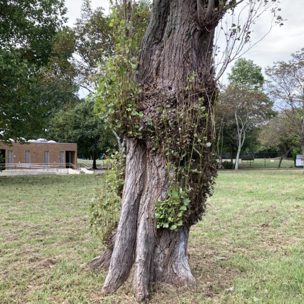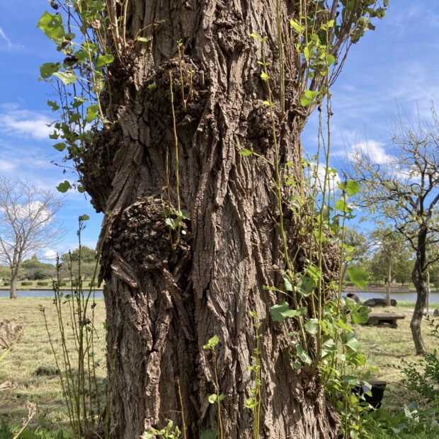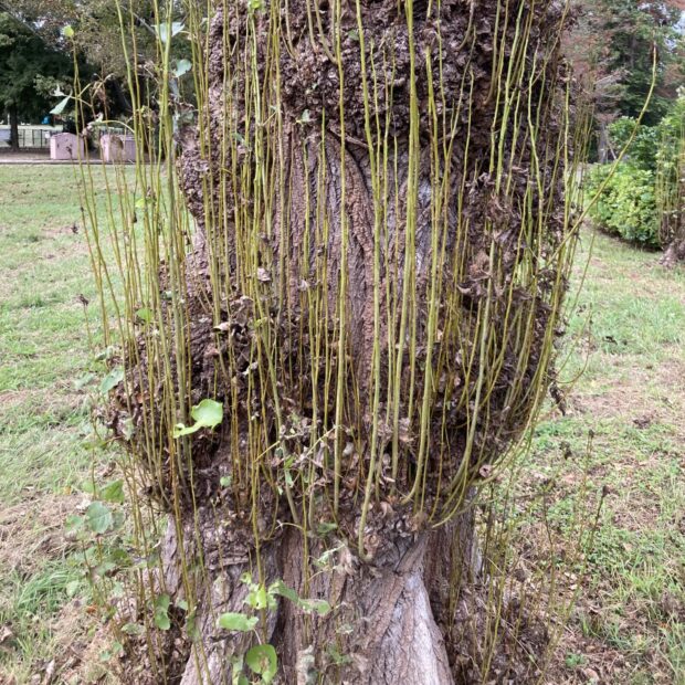 樹皮は灰色っぽいこげ茶色で、 縦に深く裂けています。 幹の下の方からも黄色っぽい茶色の若く細い枝がたくさん出ます。