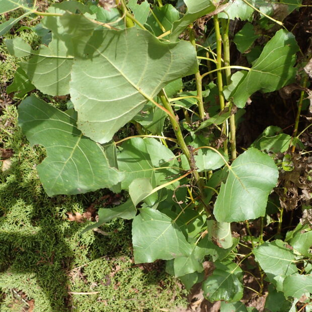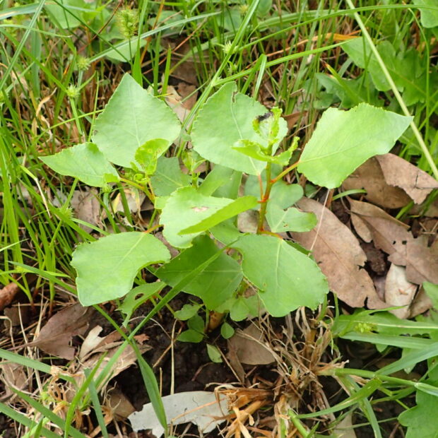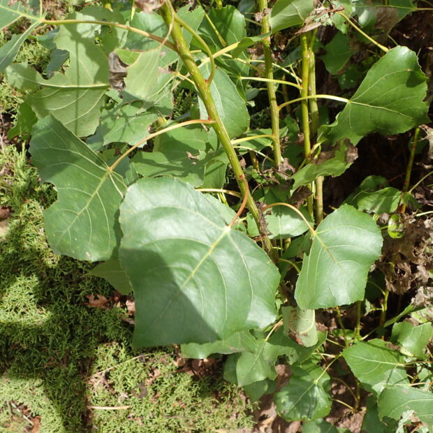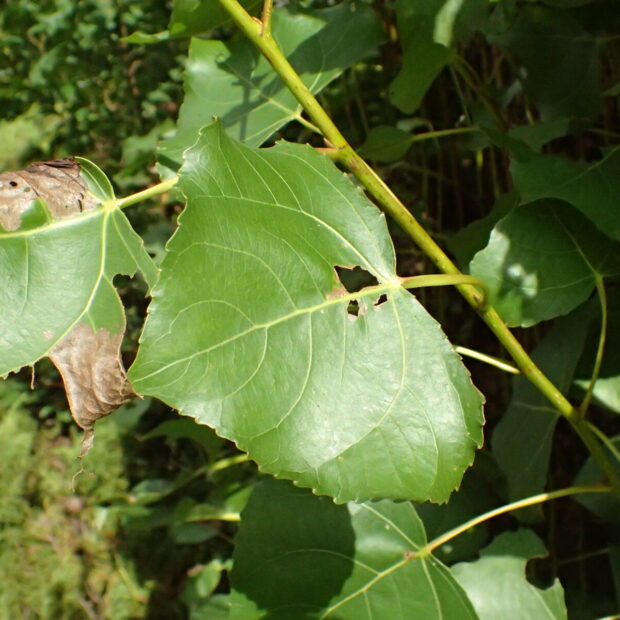 先がとがったおにぎり型、 またはひし形の葉です。 3〜7cmと長めな葉の柄は、 つぶれたようにぺったんこ。 風が来たらヒュンヒュンと曲がってかわすことができるようになっています。