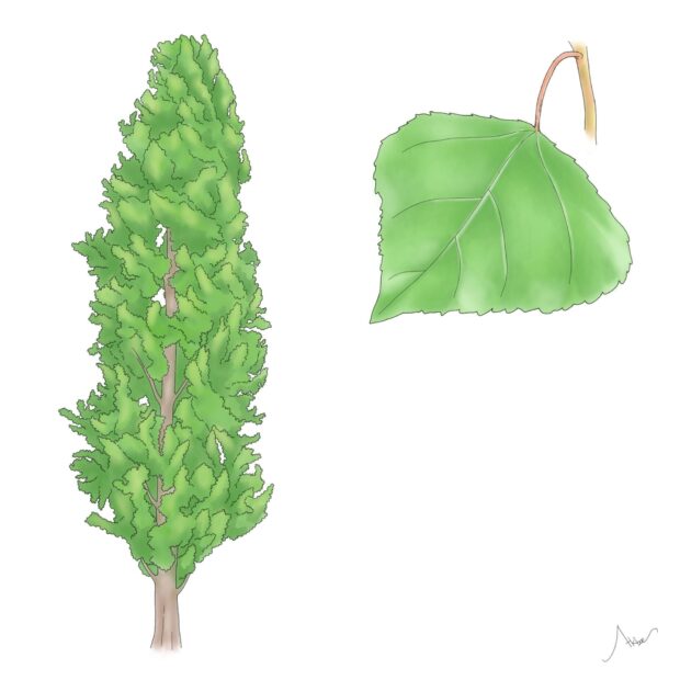 ヨーロッパや西アジア原産の木で、 明治時代に日本にやってきました。 セイヨウハコヤナギ、 イタリアヤマナラシ、 イタリアポプラとも呼ばれます。 背が高くスラとした樹形が特徴です。 「ポプラ」の名前で親しまれています。