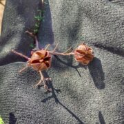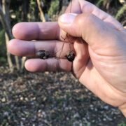 黒っぽい丸い実がなります。 実が割れると中から羽のついた種がたくさん出てきます。