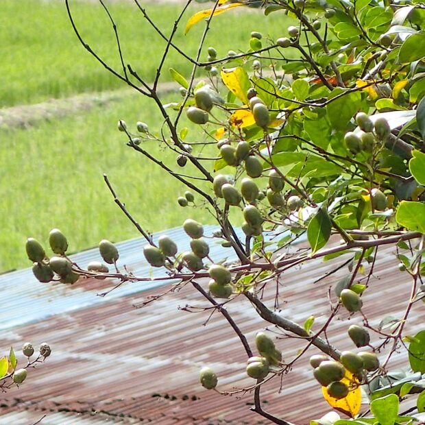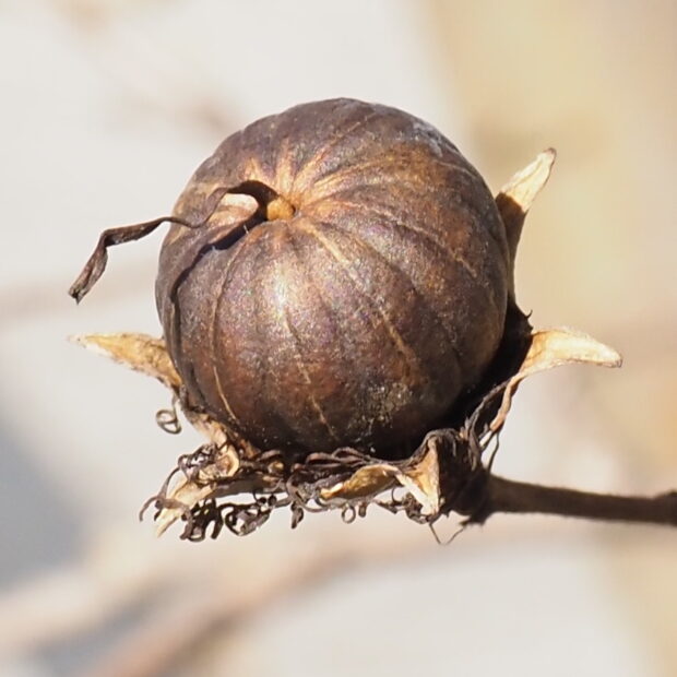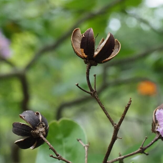 黒っぽい丸い実がなります。 実が割れると中から羽のついた種がたくさん出てきます。