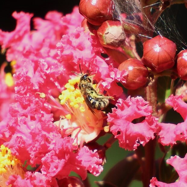 花にはクマバチなどの昆虫がやってきて、 花から花へ忙しそうに飛び回っています。