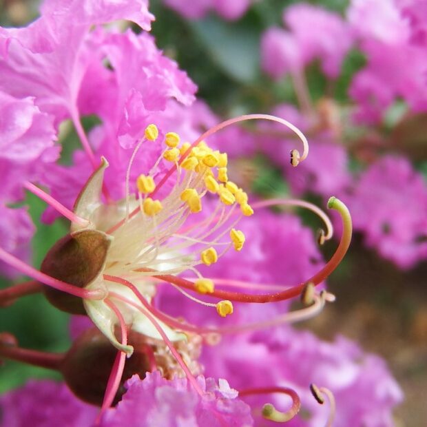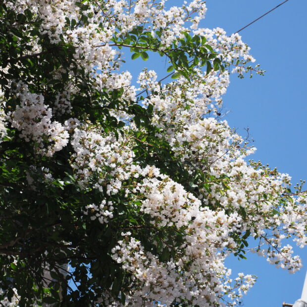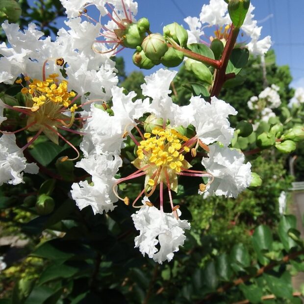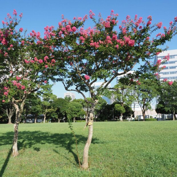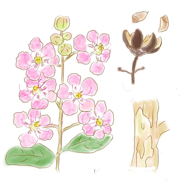 幹がサルが滑るくらい滑らかなので「サルスベリ」と名前につきました。 赤やピンクの美しい花が100日も咲くということで「百日紅」(ヒャクジツコウ)と呼ばれたり漢字で書いたりされます。