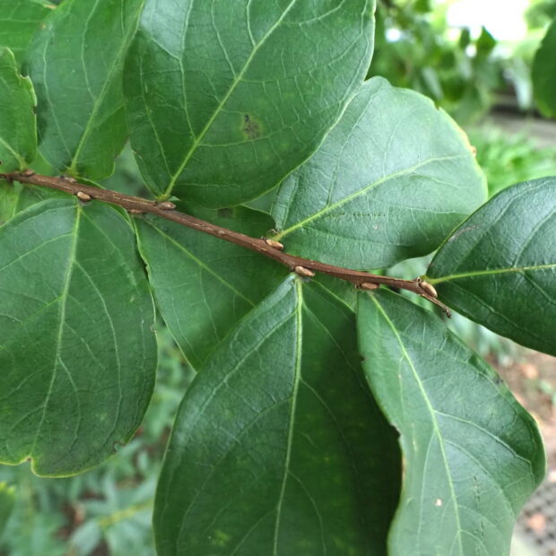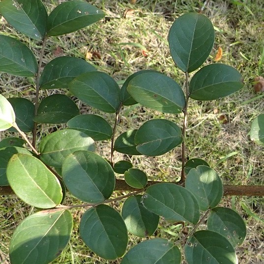 小さめの丸っこい葉が、 枝の「右、 右、 左、 左…」のように2枚ずつ交互に枝につきます。 葉柄はほとんどありません。