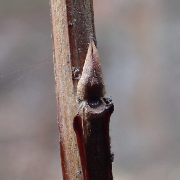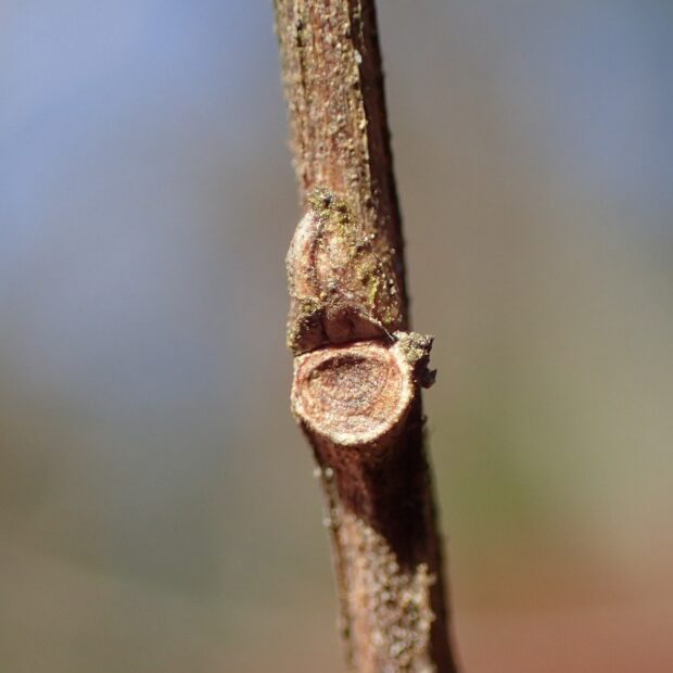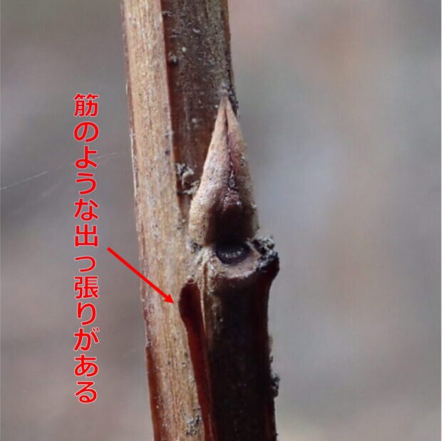 水滴型の小さな芽です。 細い枝の芽の横には、 枝からクイっと飛び出し、 下に向かって筋のような出っ張りがあります。