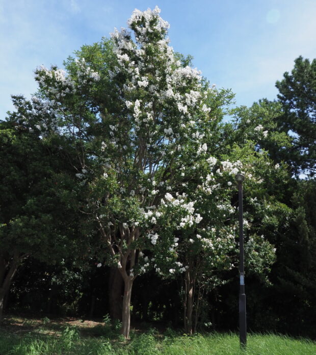 幹がツルツルなのが特徴です。 サルも滑るぐらいツルツルなので「さるすべる」→「サルスベリ」となったと言われています。 花の少ない真夏に美しい花をさかせるので、 とても目立ちます。 中国原産で、 江戸時代より前に日本に渡来したといわれています。