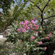 幹がサルが滑るくらい滑らかなので「サルスベリ」と名前につきました。 赤やピンクの美しい花が100日も咲くということで「百日紅」(ヒャクジツコウ)と呼ばれたり漢字で書いたりされます。