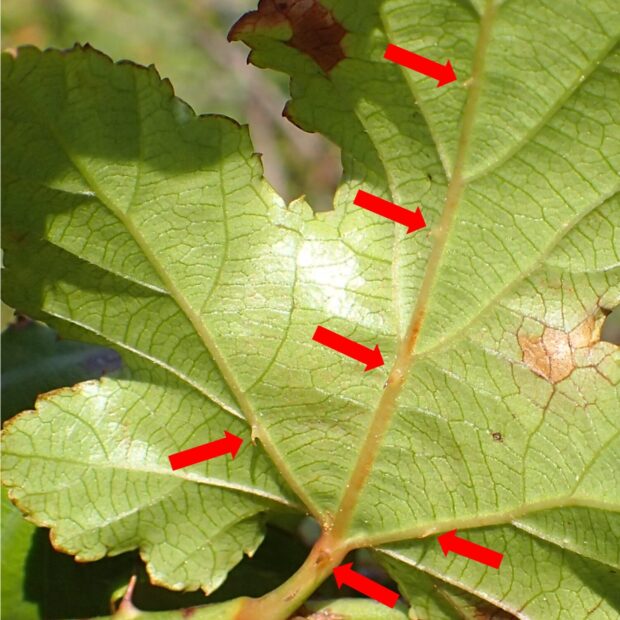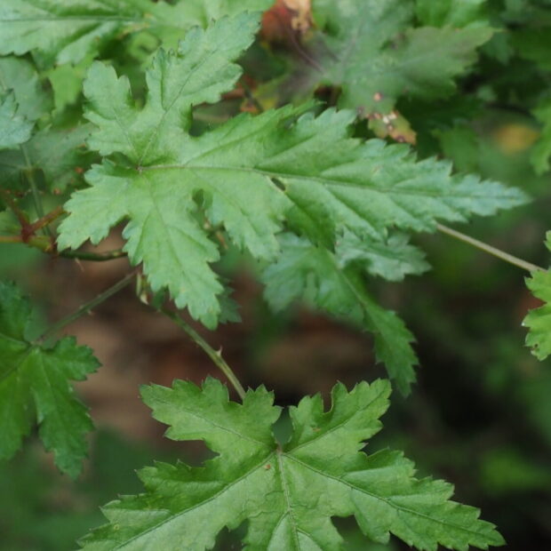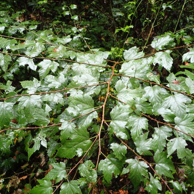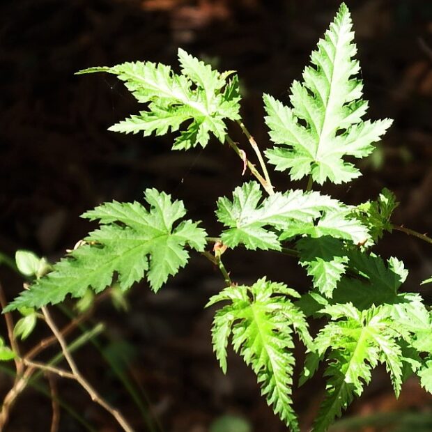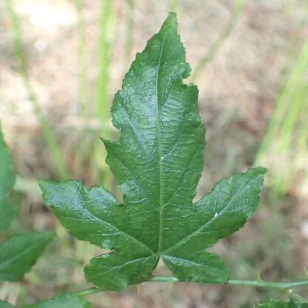 名前の通り、 モミジ風な形の葉っぱです。 葉柄にも、 裏側の葉脈上にもトゲがあります。