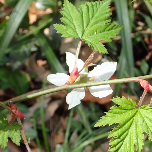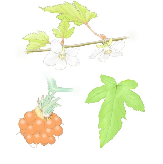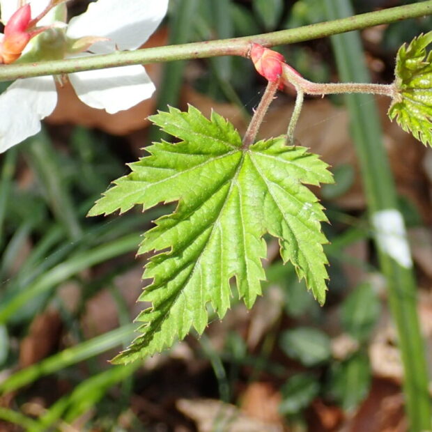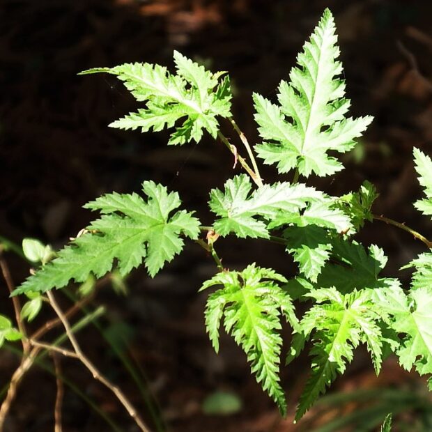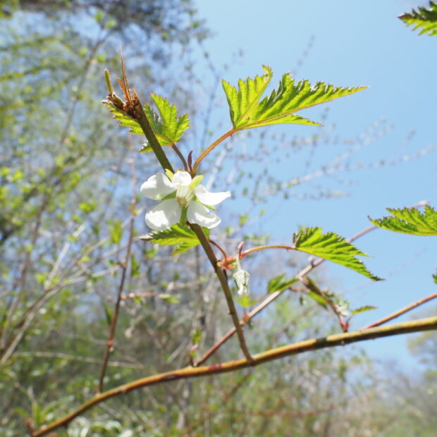 同じモミジイチゴでも、 葉っぱの形はいろいろです。 葉が「モミジ風」のキイチゴを見つけたら、 実の色、 トゲの形やトゲのあるところを観察し、 葉っぱの形にも注目してみましょう。
