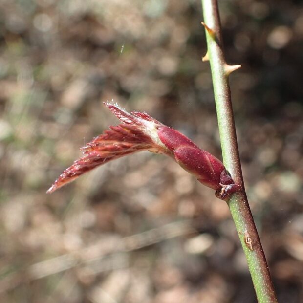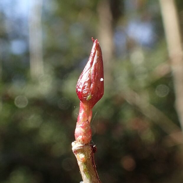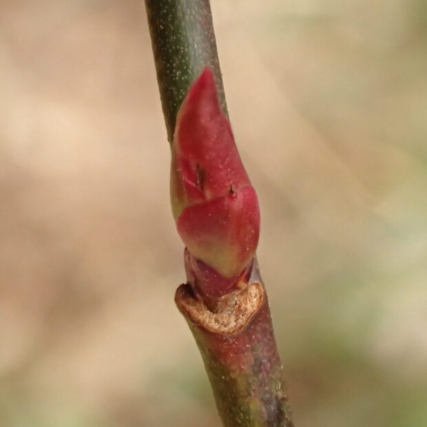 赤くて長い水滴型の冬芽、 黄緑色の枝とまっすぐなトゲがモミジイチゴの目印です。 枝に陽が当たるところは赤くなります。 葉痕はとても小さいですが、 維管束痕は3つあり、 お顔が見えることがあります。
