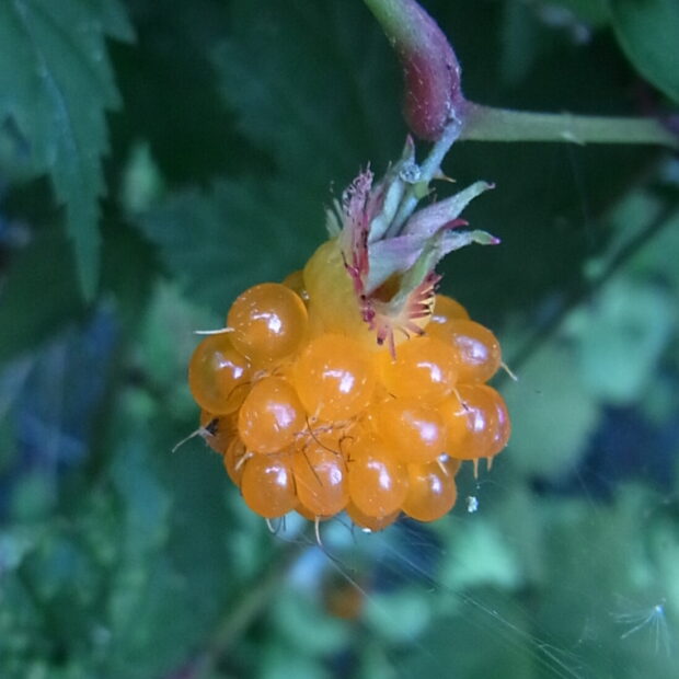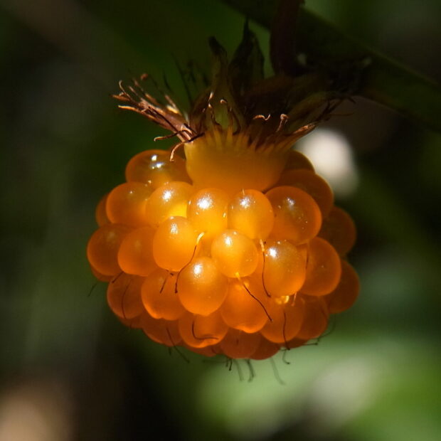 明るいだいだい色の実はピカピカの粒の集まりで、 食べられます。 よく熟れた実は、 触るとツブツブがつながったままほろりと外れ、 落ちやすくなっています。