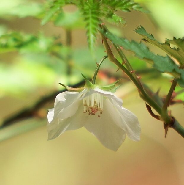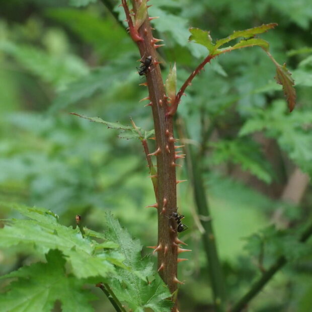 たいてい2年で地上部が枯れてしまうのがキイチゴの仲間の運命です。 実に向かって手を伸ばすと、 たくさんのとげにチクチクされるか、 服の袖をとらえられます。 ちゃんと種まきをしてくれる動物かどうか厳しい判定をしてくる(?)ので、 付き合うときは覚悟しましょう。