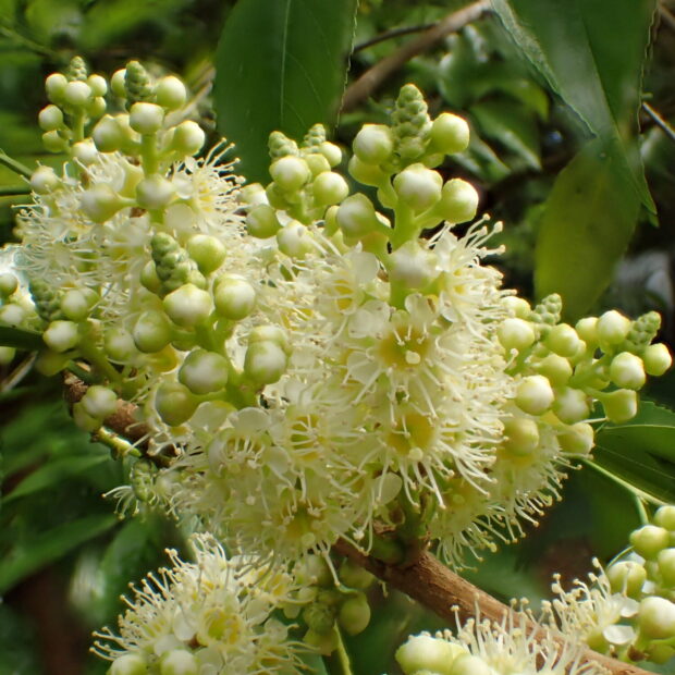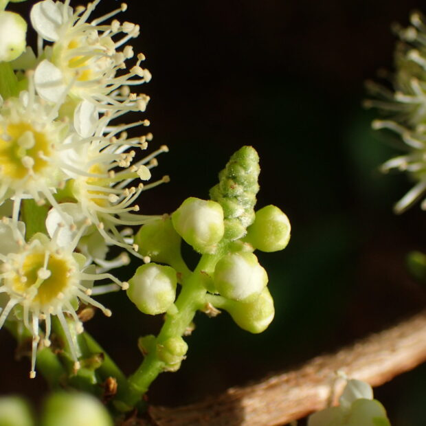 秋、 その年の新しい枝の葉の脇から、 小さな白い花が集まった3cmくらいの花の房をつけます。 長い雄しべが30〜50本もあって、 フサフサして見えます。