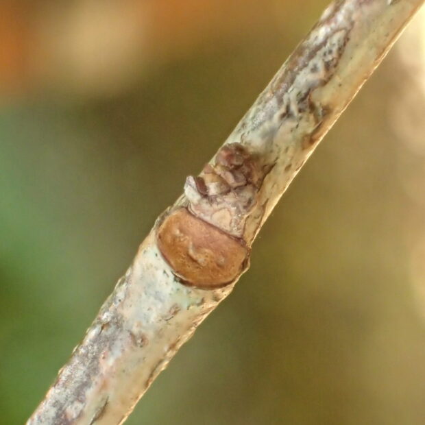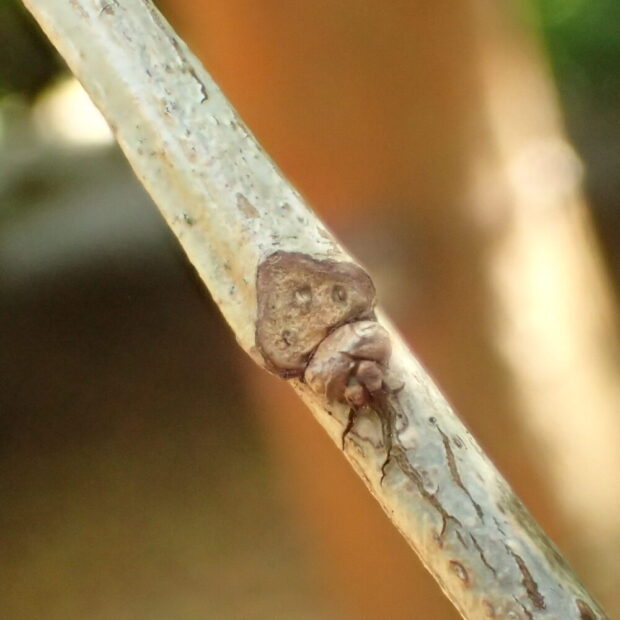 うすい茶色の小さな硬い冬芽です。 多くのバラ科の木と同じように、 葉痕の維管束痕は3こで、 お顔に見えます。