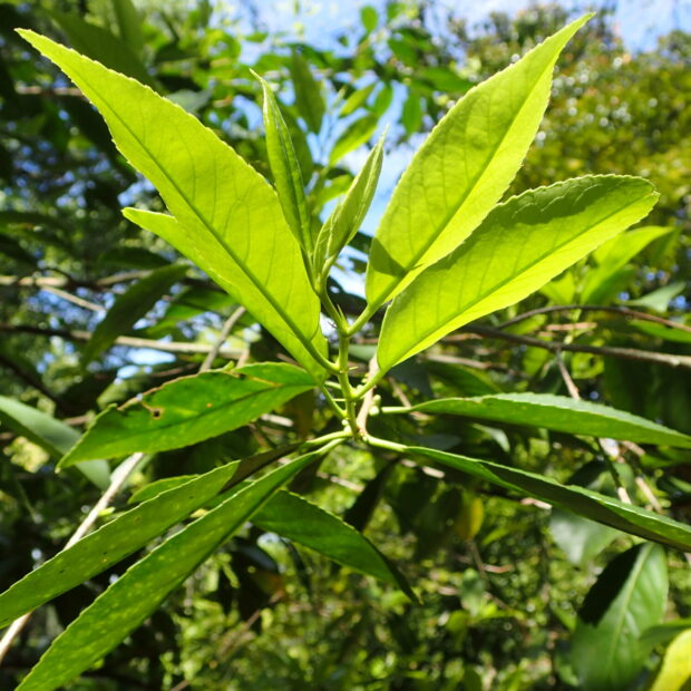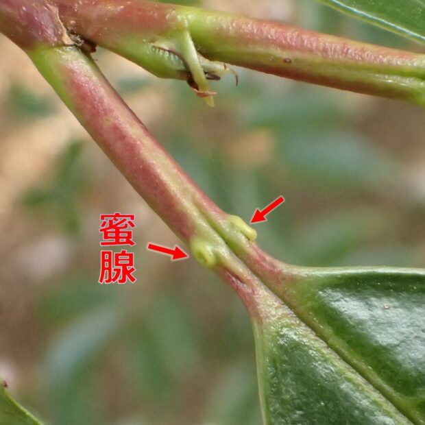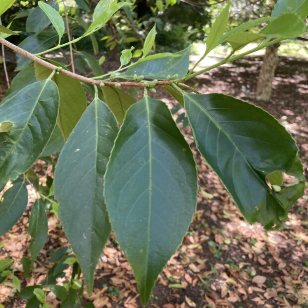 長さが20cm近くになる細長くとがった葉です。 毛はなくつるつるしていて、 縁には細かく鋭いギザギザがあります。 柄にイボのような蜜腺があります。