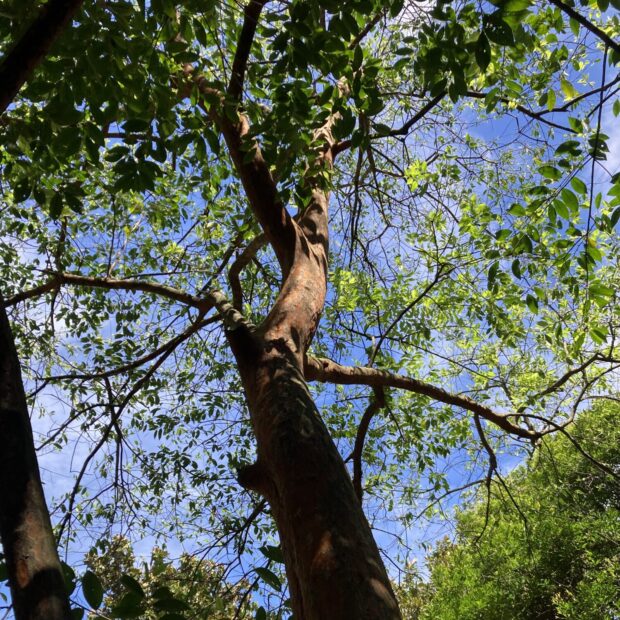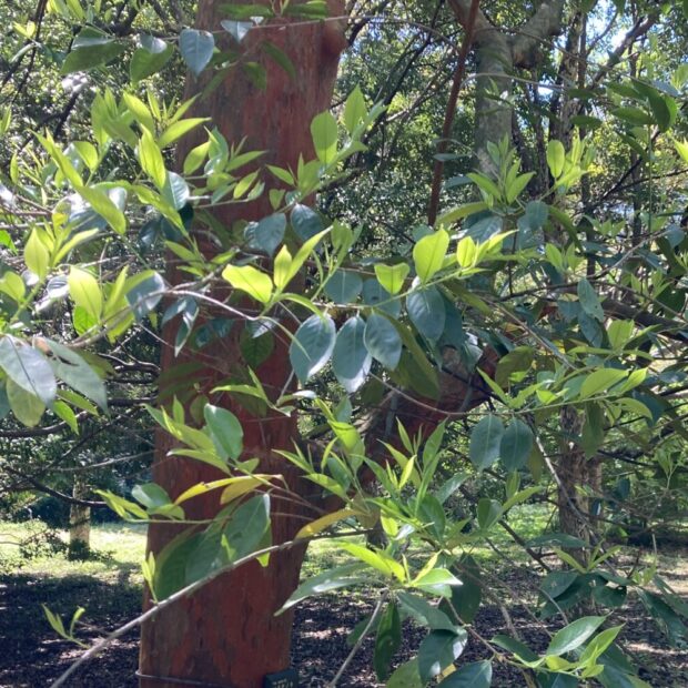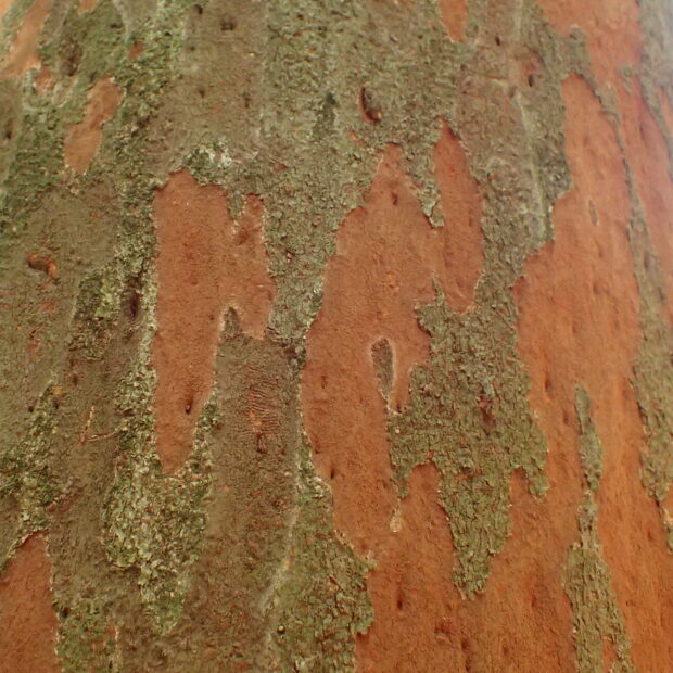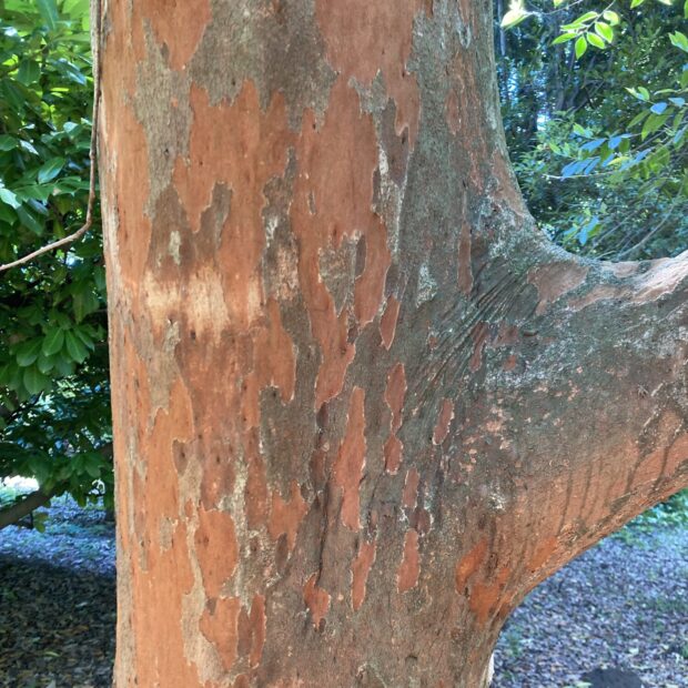 樹皮は茶色っぽい灰色で、 剥がれ落ちると赤っぽい茶色になり、 まだらな模様のようになります。 身ぐるみ剥がされたような、 日焼けして皮がむけたような痛々しい感じですが、 普通の成長です。