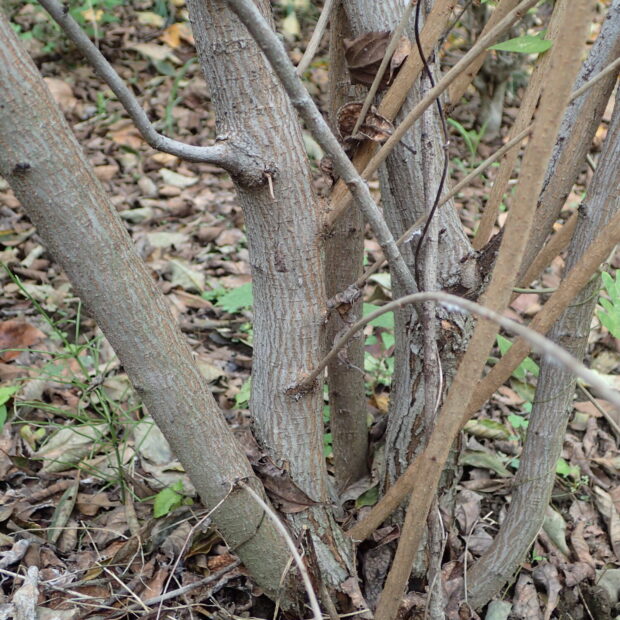 幹は縦に粗い筋のある褐色です。 若い幹は白っぽく、 縦の筋があります。 若い枝は茶色です。