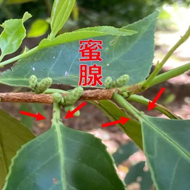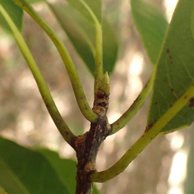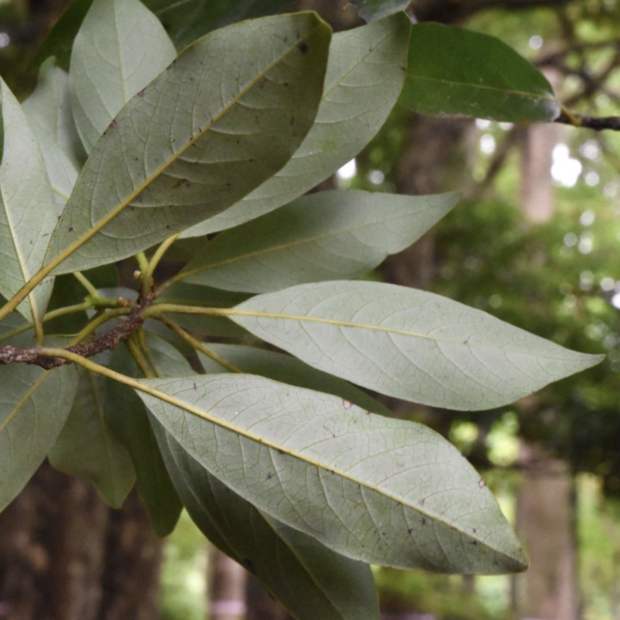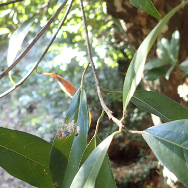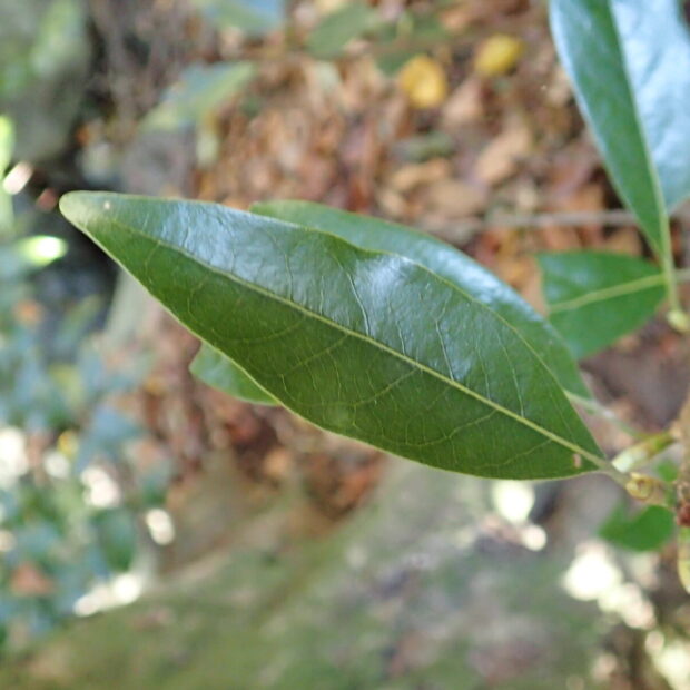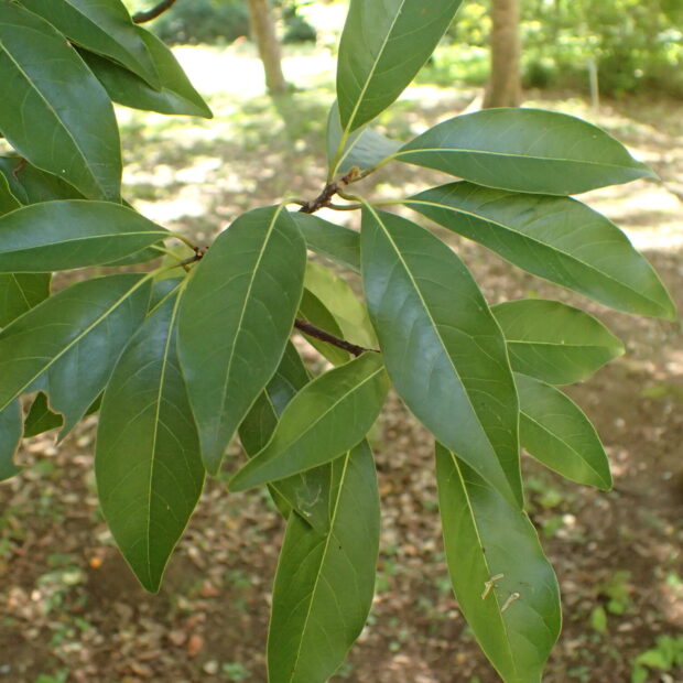 ふちにギザギザのない葉で、 先が細くなりますが鋭くはとがりません。 互生で枝先に集まってつきます。 表面はつるつるで光沢があります。 裏面は白っぽく、 初め毛がありますが、 のちになくなります。