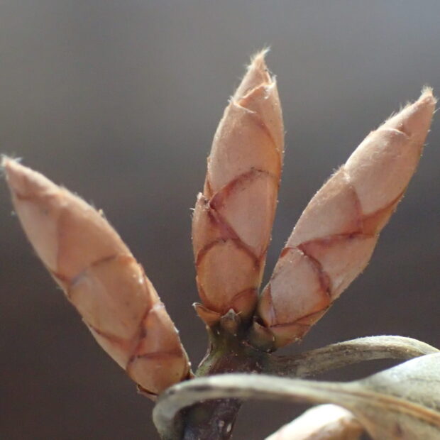 冬芽(葉芽)は細長く、 先がとがります。 黄色っぽく縁が赤い芽鱗が4〜5枚あります。