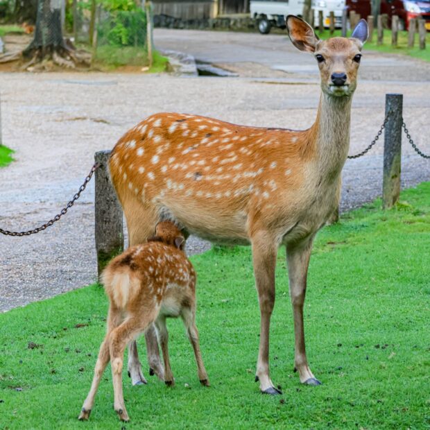 樹皮が部分的にはがれ落ち、 鹿の子(かのこ)模様になるのが「鹿子の木」の名前の由来です。 シカの子や夏毛には白い点々の模様があり、 それを「鹿の子模様」と呼びます。