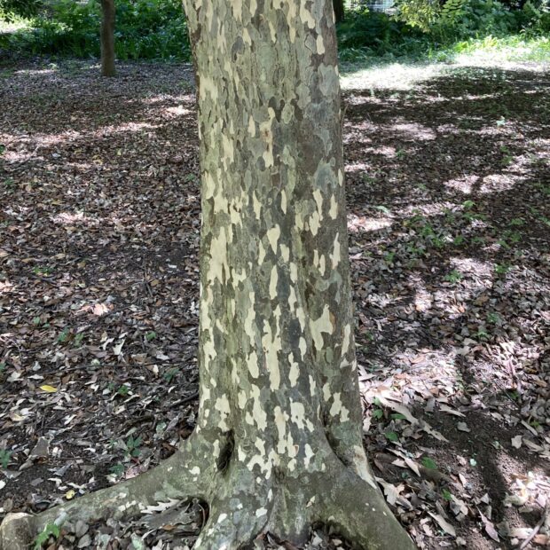 樹皮は灰色がかった黒っぽい色ですが、 小さく薄くはがれ落ち、 鹿の子(かのこ)模様になります。 これは病気などではなく、 幹や枝が太っていくときに少しずつ古い皮を脱いでいっているのです。