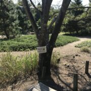 葉痕の中に冬芽があり(「隠芽」いんが)、 葉痕の上のポチッとした小さな芽は副芽であるといわれています。 葉痕の維管束痕は3つで、 お顔に見えます。