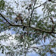 トモエガの仲間(カキバトモエ、 ハグルマトモエ、 オスグロトモエなど)の大きな幼虫が葉や幹にいることがあります。