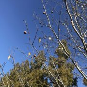 先がとがり、 きっちりと芽鱗につつまれた水滴型の冬芽です。 葉痕の維管束痕は3つで、 はっきりとしたお顔に見えます。 他の木が芽吹き始めるころ、 表情を変えずに、 まだ寒そうにかたい帽子をかぶっている子たちです。