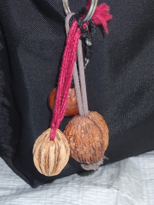 ハンカチノキの実はとても固いですが、 穴をあけてストラップにできます。 万力で実を固定して、 ドリルで穴をあけます。 道具がないとできません。