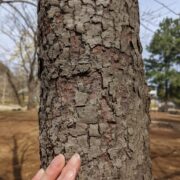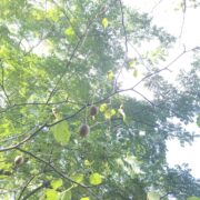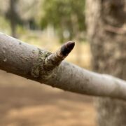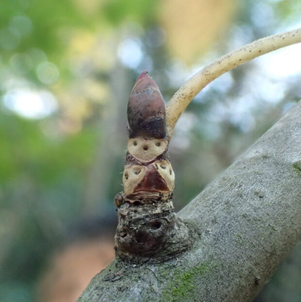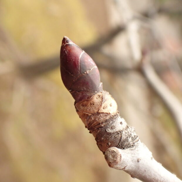 先がとがり、 きっちりと芽鱗につつまれた水滴型の冬芽です。 葉痕の維管束痕は3つで、 はっきりとしたお顔に見えます。 他の木が芽吹き始めるころ、 表情を変えずに、 まだ寒そうにかたい帽子をかぶっている子たちです。