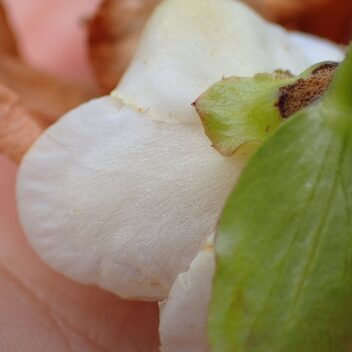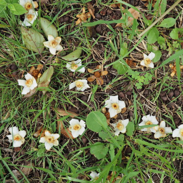 ヒメシャラの花びらの裏を触ってみましょう。 ふわふわの感触です。 落ちている花びらは、 小さくなってもっと毛深い感じになります。 ヒメシャラは落ちている花も見どころです。